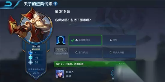 王者荣耀夫子的进阶试炼“名师奖励不包括下面哪项”答案是什么?王者荣耀夫子的进阶试炼“名师奖励不包括下面哪项”答案。今天小编给大家带来了王者荣耀夫子的进阶试炼“名师奖励不包括下面哪项”答案,希望能帮到大家。 王者荣耀夫子的进阶试炼“名师奖励不包括下面哪项”答案