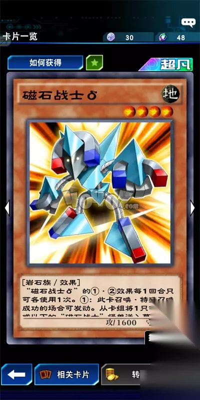 t15_2-t15_1:7.0 标签: 怪兽 在游戏王决斗链接中,随着武藤游戏这个新角色的更新,也是为游戏带来了磁石战士这个系列的几张新卡,这几张卡的效果都是相当强力的,磁石战士系列怪兽中的大哥是磁石战士磁铁女神,但是想要召唤磁石战士磁铁女神这张卡的话是比较难的,那么在这种情况下,就需要这一张磁石战士σ登场了,那么这一张磁石战士σ究竟有着怎么样的效果呢?接下来就随着小编一起来看看吧。 游戏王决斗链接磁石战士σ卡牌介绍 卡牌介绍 卡牌名称:磁石战士σ 卡牌品质:超凡 获取方式:武藤游戏升级奖励 卡牌类型:地属性岩石族效果怪兽 卡牌属性:1600攻击力/1400守备力 卡面展示