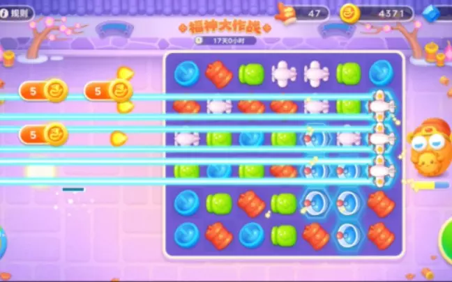 给福神大作战配了一个开心消消乐的背景音乐~ 68个换位手套换了680个新春兑换币,相当于1手套=10币。 活动为期17天,总共有34次免费的推关机会,按每局可以…