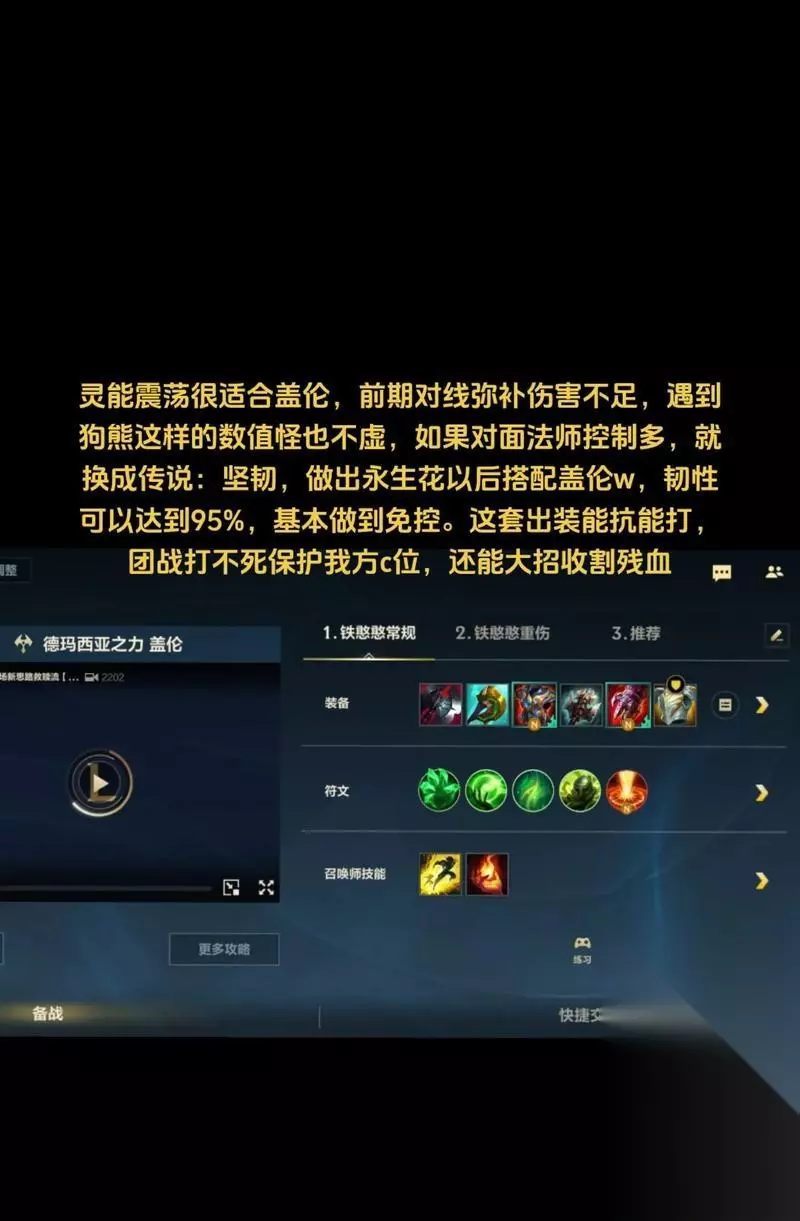 本文目录一览 1、掌握LOL盖伦玩法,成为无敌战士 在英雄联盟这个多人在线游戏中,每个英雄都有各自独特的技能和特点。而盖伦作为一个坦克型英雄,以其强大的生存能力和输出能力成为了许多玩家钟爱的角色之一。本文将详细介绍LOL中盖伦的玩法技巧,帮助玩家更好地掌握这个统御战争之王,成为比赛中的无敌力量。