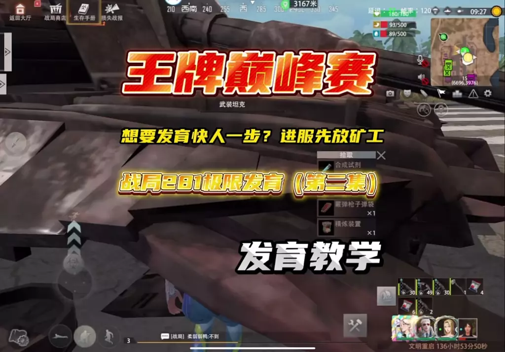 这是《王牌战争:文明重启》的偷服教学,分享了生存技巧:战局少说话、少触发死亡播报,把家建在偏僻处,等服霸睡着再行动,还展示了游戏内拾取物资、搭建设施等玩法。