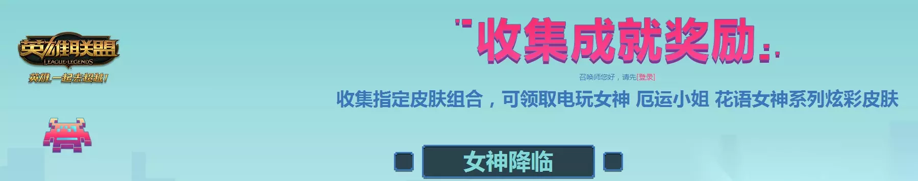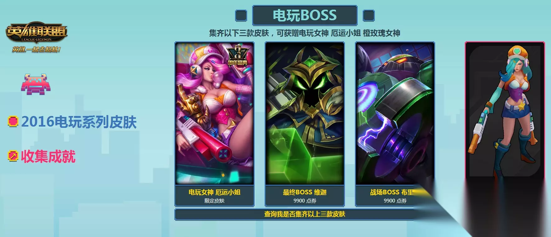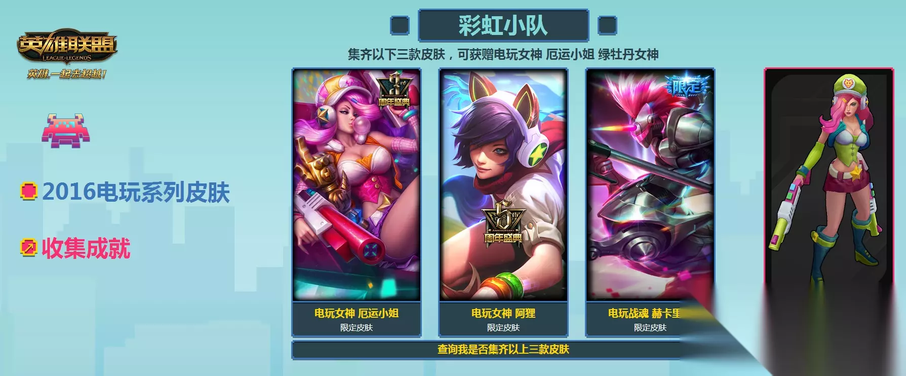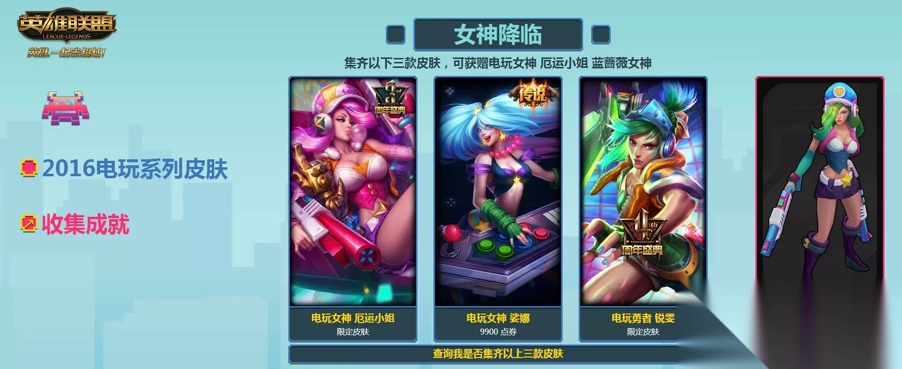 厄运小姐 蓝蔷薇女神 集齐以下三款皮肤,可获赠电玩女神 厄运小姐 蓝蔷薇女神 电玩女神 厄运小姐 电玩勇者 锐雯 电玩女神 娑娜