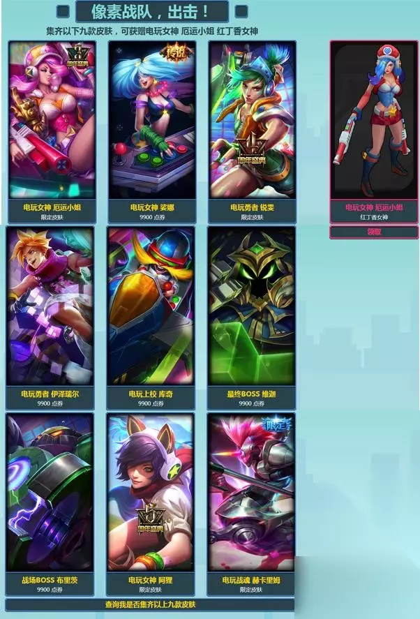 收集电玩皮肤奖励 如果你至少拥有以下三款电玩皮肤,即可免费领取电玩女神厄运小姐的限定炫彩皮肤;此活动在2016年的9月份开启,至今仍然有效,因为真的不知道有效期到底有多久,所以有皮肤的抓紧时间领取哦.....