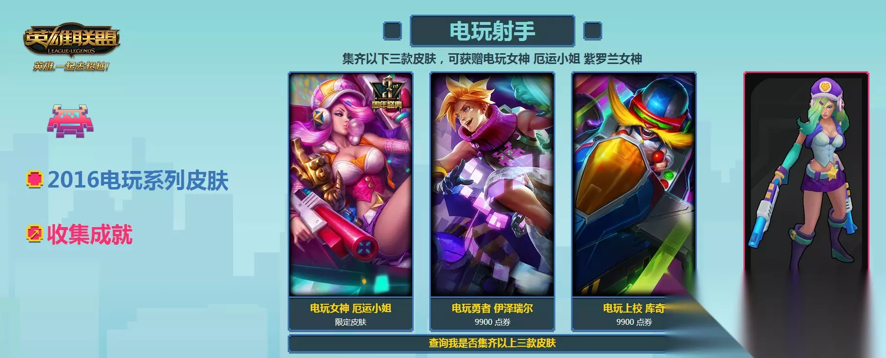 厄运小姐 紫罗兰女神 集齐以下三款皮肤,可获赠电玩女神 厄运小姐 紫罗兰女神 电玩女神 厄运小姐 电玩勇者伊泽瑞尔 电玩上校库奇