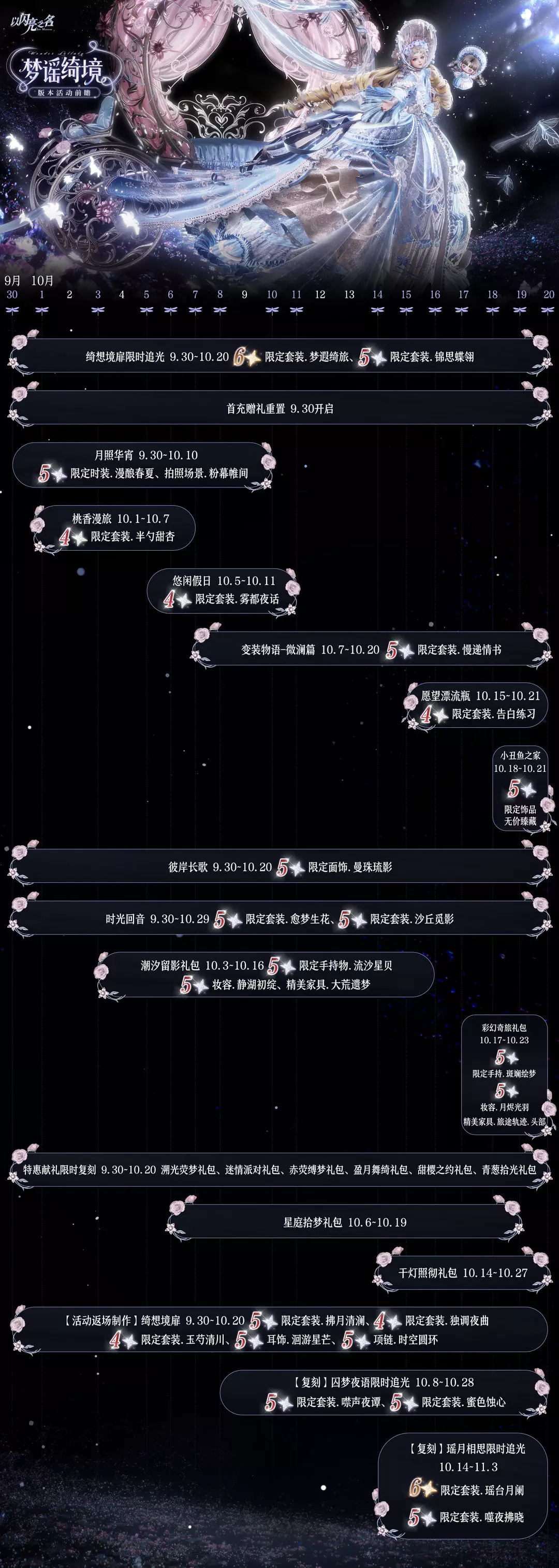 10月8日10:00–10月28日23:59,追光活动【囚梦夜语】上线,5星套装及SR羁绊限时返场!该追光活动每登场10次内必获得SR羁绊或限定五星套装部件(直至集齐所有限定五星套装),集齐每套限定套装后,还可以额外获得该套装的专属集齐称号及专属休闲动态动作,并可在拍照-动态动作里使用。此外,【囚梦分解】商店也将同期限时开启,通过分解该限时追光活动内的服饰,可获得限定时装部件【薰光叙诗】、【旧梦回响】、【鱼曳漾梦】、动态拍照动作【弹跳节拍】、拍照动作【圣礼羽落】及头像框、囚梦风向标、心念之蝶、知之钥、金币等材料道具!