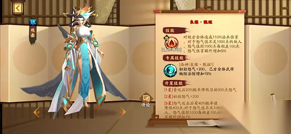 怒气?看这招“覆水难收” 在《胡莱三国3》中,传说级武将良缘·甄姬,被定位为减怒队输出,这个定位一方面取决于她的升星效果,比如一星可令其普攻后有概率降低目标300点怒气;二星可令其初始怒气+200;三星可令其怒气攻击后大概率使敌方怒气降低400点。“减怒”效果可见一斑了吧! 另一方面取决于她的怒气技能【覆水难收】,该技能可对敌方全体造成110%的法术伤害,对于怒气值不足1000点的敌人,怒气值距离1000点相差每100点,怒气伤害额外增加5%。 此外,良缘·甄姬的专属技能“洛神”,还有增加初始怒气,提升己方全体武将物防、法防的功效。 减怒气值不是最终目的,用你相差的怒气值增加对你的伤害才是王道,就问你:“这洛神狠不狠?”。