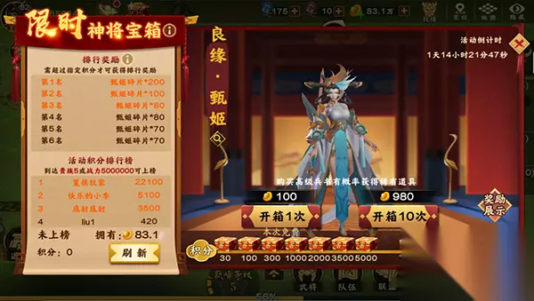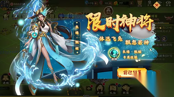 限时神将活动登场,开宝箱领“洛神” 说了这么多良缘·甄姬的妙用,那么如何才能获得呢?就在今天,全新的“限时神将宝箱”活动中,开启宝箱就有可能获得良缘·甄姬的武将碎片,如果在排行榜中获得前十的排名的话,还将获得额外的良缘·甄姬碎片,助你为其升星、获得战法,进行深度培养,所以,时不我待,快来将良缘·甄姬收入麾下吧!