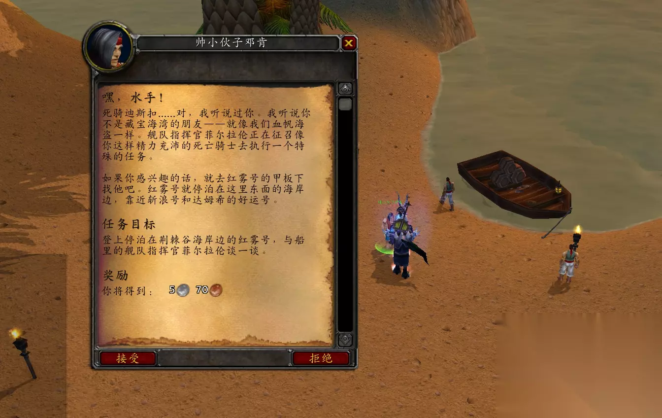 任务是让你去蛮荒海岸的船上找舰队指挥官菲尔拉伦,和菲尔拉伦对话领取下一个任务,任务是“敬礼,舰队司令!”,让你去藏宝湾海击杀两个NPC,这个任务并不难很容易就能完成。另外和菲尔拉伦对话还会送你一套血帆海盗的衣服,让你真正成为血帆海盗的一员,一共有4件,分别是血帆衬衫、血帆短裤、血帆腰带和血帆长靴,完成任务后会拿到血帆舰长之帽,一身血帆海盗行头就算齐了。
