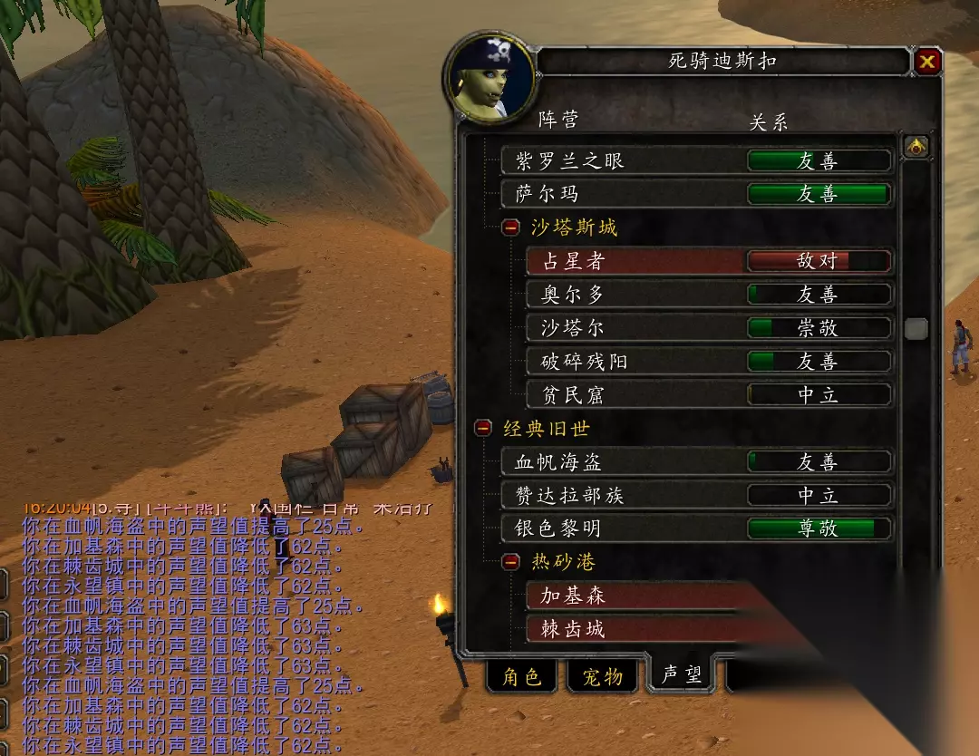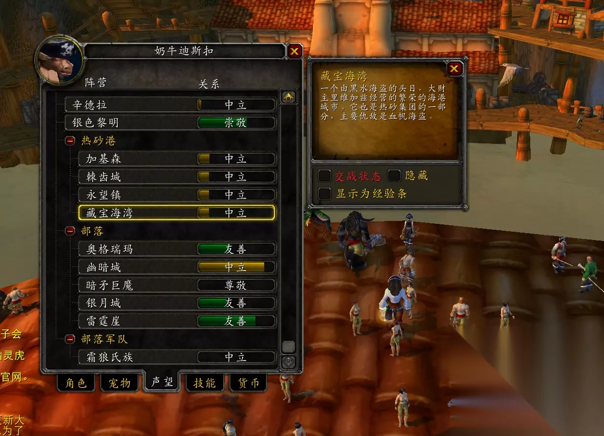 继续往下做血帆海盗的任务就得刷声望了,血帆海盗的死对头是藏宝海湾,所以击杀藏宝海湾的卫兵就能获得血帆海盗的声望。玩家点击自己的头像,打开声望一栏找到藏宝海湾的声望,点开藏宝海湾的声望,可以看到有“交战状态”4个字,勾选“交战状态”,这样就可以击杀藏宝海湾的卫兵,击杀一个卫兵获得25点血帆海盗的声望。
