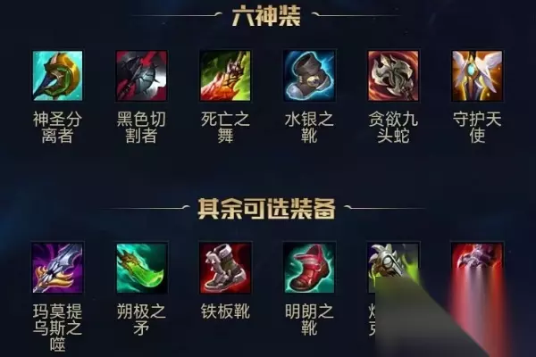 3、六神装 神圣分离者、黑色切割者、死亡之舞、水银之靴、贪欲九头蛇、守护天使。 4、其余可选装备 玛莫提乌斯之噬、朔极之矛、铁板靴、明朗之靴、炼金朋克链锯剑、斯特拉克的挑战护手。
