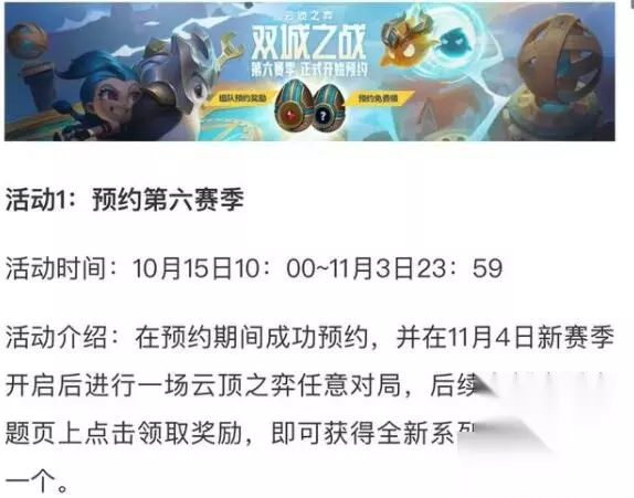 PBE是在10月20日上线的,测试服一般都要比国服早上半个月,根据时间线来反推:云顶之弈S6国服正式上线的时间是在11月4日。 云顶之弈S6国服11月4日上线还有一条佐证:掌盟在10月中旬的时候开启了S6的预约活动,截止时间是在11月3日23:59。那么活动结束之后便是11月4日正式上线。和我们反推的时间线是一致的。