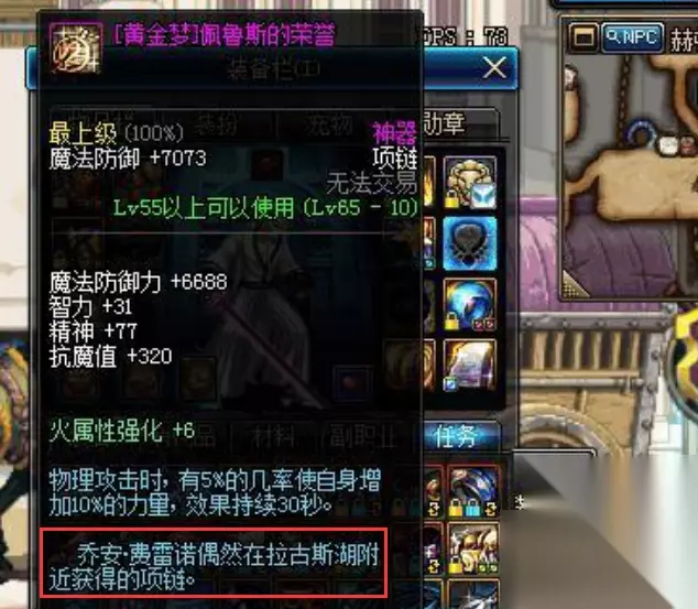 值得注意的是目前大部分猴戏装备都已经被和谐了,当然佩鲁斯也不例外,但是[黄金梦]佩鲁斯的荣誉却侥幸得不在策划的名单中,在刷图触发卸下的时候依然有10%的力智加成效果,不过此[黄金梦]佩鲁斯非彼[黄金梦]佩鲁斯,在拍卖购买的并不可以猴戏,只有在押镖掉落的佩鲁斯才可以猴戏,无奈押镖副本已经删除了,所以拥有可以猴戏的佩鲁斯玩家并不多,拥有者一定要好好保存。