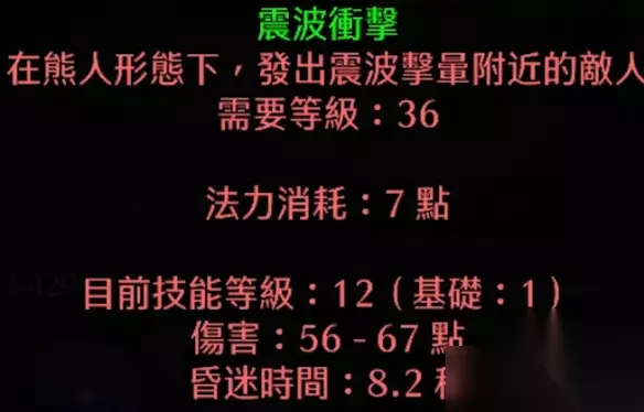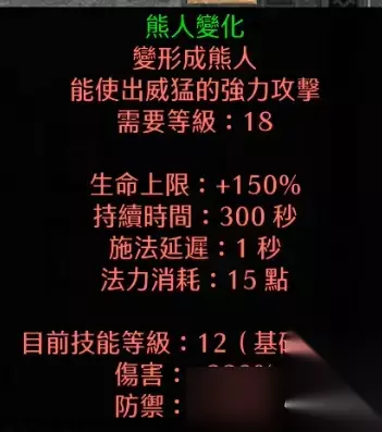 为什么要点出变身呢,因为在变身的期间依旧可以召唤生物 所以相当于白嫖了一个加血加防御的buff 选择变熊是因为能够提供高额的生命和防御加成 而且在24级还能学到震波冲击,来完成一个aoe控场
