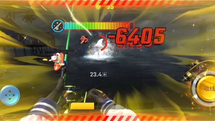 这是手游《欢乐钓鱼大师》的游戏画面,展示了钓鱼时收线、摆杆等操作,还有张力值、距离等游戏数据,杰瑞米瓦德相关元素也在其中,呈现了刺激的钓鱼游戏过程。