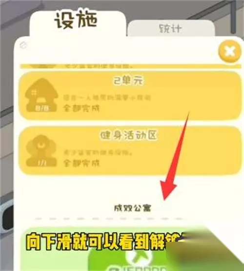 3、第三步:我们滑动到最底部,可以解锁新的区域建筑——成双公寓。