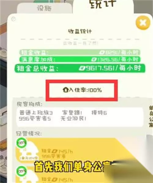?我是大房东是一款十分受欢迎的经营类游戏,游戏中有单身公寓还有成双公寓,不少小伙伴在问成双公寓的解锁方法,下面小编就给大家带来,希望可以帮助到有需要的玩家。 注意:如果设施中找不到成双公寓,点击左下角的设置齿轮,选择云存档进行更新游戏。 1、第一步:首先我们需要先将单身公寓招募租户,当入住率达到100%以后才能进行新区域的解锁。