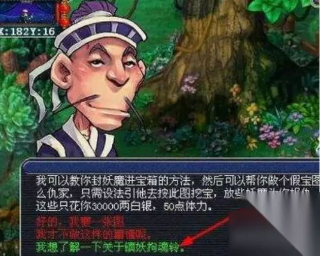 2、在长寿郊外找到鬼谷道人之后,点击他选择第三个“我来了解一下镇妖拘魂铃”。