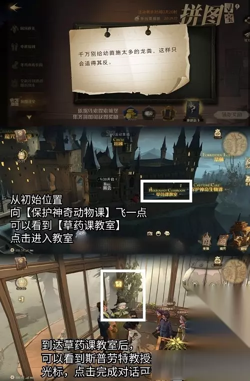 前往草药课教室(可从城堡外飞行过去,也可以从地图上选择),到达教室后找到斯普劳特教授,对话后可获得拼图。