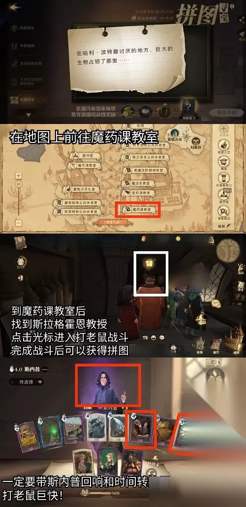 前往魔药课教室,找到斯拉格霍恩教授,点击光标对话后需要帮教授打老鼠(带斯内普回响和时间转换器,打老鼠超快!)打完老鼠后可获得拼图。 2、千万别给幼苗施太多龙粪,这样只会适得其反。