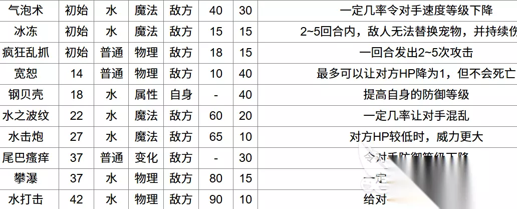 宽恕这个技能虽然是普通的物理攻击技能,这个技能最有一个关键的用处就能能够把对方的hp下降到1点,尾巴瘙痒则是能够使对方的防御等级下降,攀瀑会有一定的几率让玩家陷入到恐惧之中,水打击则能够给敌人造成90点的伤害,这一套技能主打的就是先降低敌方的防御和hp,让敌人陷入到恐惧在进行收割。 水打击+尾巴瘙痒+攀瀑+水击炮这一套技能组,水打击和水击炮都属于能够造成伤害的技能,不过水打击属于物理伤害,水击炮则属于魔法伤害,对方的hp越低该技能造成的伤害也就越高,先使用尾巴瘙痒降低对方防御力,然后在攀瀑让对手恐惧最后在用水打击和水击炮这两个技能轮番的攻击对手就能轻松取得胜利。
