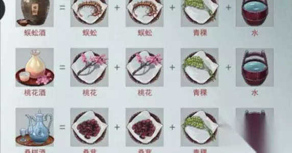 江湖悠悠三级酒谱有哪些 碧芳酒:莲花+水+黍米+莲花 即墨醪酒:黍米+水+黍米+黍米 松醪酒:松针+水+黍米+松针 葡萄酒:葡萄+葡萄+葡萄+水 黍米烧:黍米+小麦+黍米+黍米