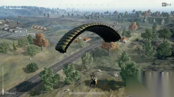 ▲调整跳伞方向和落点 军事基地、防空洞、学校附近降落的人会茫茫多,跳伞的时候不建议新手往这些资源密集的区域降落,太偏远的废墟:如S山废墟也不建议降落,不仅资源匮乏,还常常会因为安全区离自己太远而被毒死。
