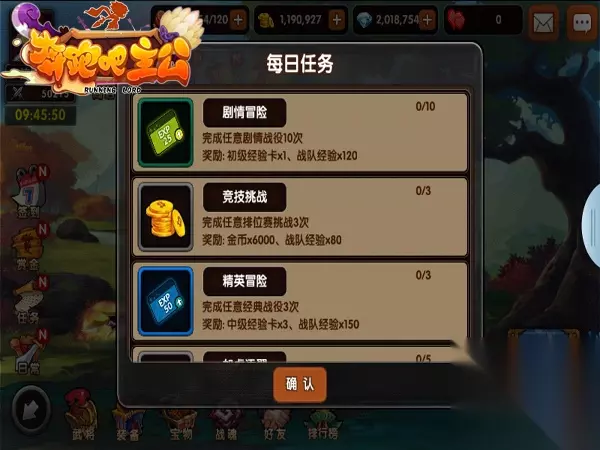 【图二】 【中午也要休息好】 中午,《奔跑吧主公》小分队已经为大家准备好了免费的体力午餐,按时领取之后主公们就可以开始中午的攻略了。午餐之后可以懒散一些,剧情冒险、精英冒险和赏金任务都适合在这个时候挑战一下。只要完成这两个任务就能获得大量升级经验卡,这样就为晚上的鏖战做好了准备。当然,碰碰运气的夺宝和赢得战魂的猜拳游戏也适合在闲适的午后完成。完成这些任务之后我们就能放心等待晚上的大战时间到来了。