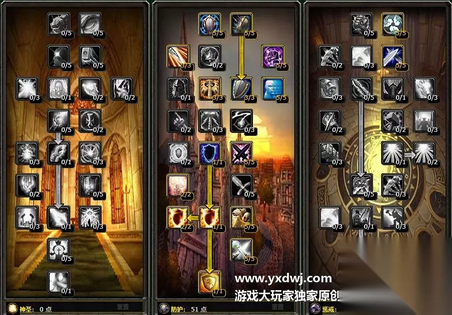 魔兽世界70级怀旧服防骑天赋 防御肯定是要点出复仇者之盾的,这个是群拉aoe还有A怪的基本。 然后投出10点加在惩戒里面。 5点祈福减少耗蓝,5点招架增加生存能力。 玩家也可以把偏斜的技能点拿出来加在法抗,王者祝福里面。