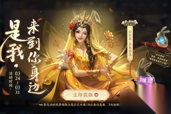 王者荣耀公孙离玉兔公主采用的是居中的经典角色,返场的时候只需要花费888点券即可获得,皮肤融入了玉兔元素,一身金饰闪闪发光,整体画风十分可爱,给我案件一种明艳动人的感觉。