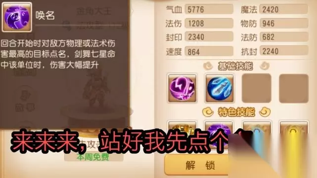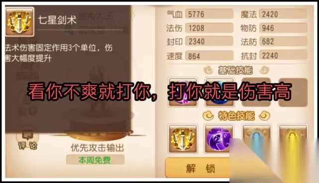被动技能[七星剑术],法术伤害固定作用3个单位,伤害大幅度提升,从伤害上弥补范围的不足。神奇的唠叨技能[唤名],回合开始时对敌方物理或法术伤害最高的目标点名,剑舞七星命中该单位时,伤害大幅提升,打架前先骂战,骂舒服了,打的就更舒服了。