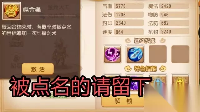 被动技能[葫芦秘法],提升剑舞七星首目标触发失心咒的概率,在封印的路上永不回头。[幌金绳]每回合结束时,有概率对被点名的目标追加一次七星剑术。