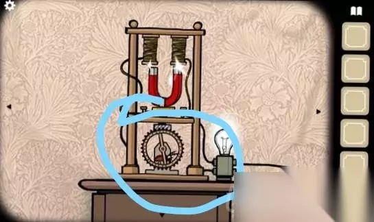 二、然后查看墙上的一个装置,把装置上的那个圆圆的东西取出来,然后再将纸片嵌进去。装回去以后播放,第一个灯泡亮了。别忘了取走上面那个很眼熟的小钥匙。