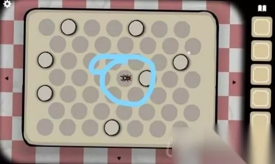 第四关 在上一关中我们喂饱了鸽子夫人,鸽子夫人将钥匙吐了出来,我们在获得钥匙之后就来到了第四关。 1、我们接着回到收音机这块,点击查看一下灰色的桌子,这里会触发一个小游戏,这个游戏的最终要求是必须用棋子将虫子给围起来,然后我们就会获得这个虫子。