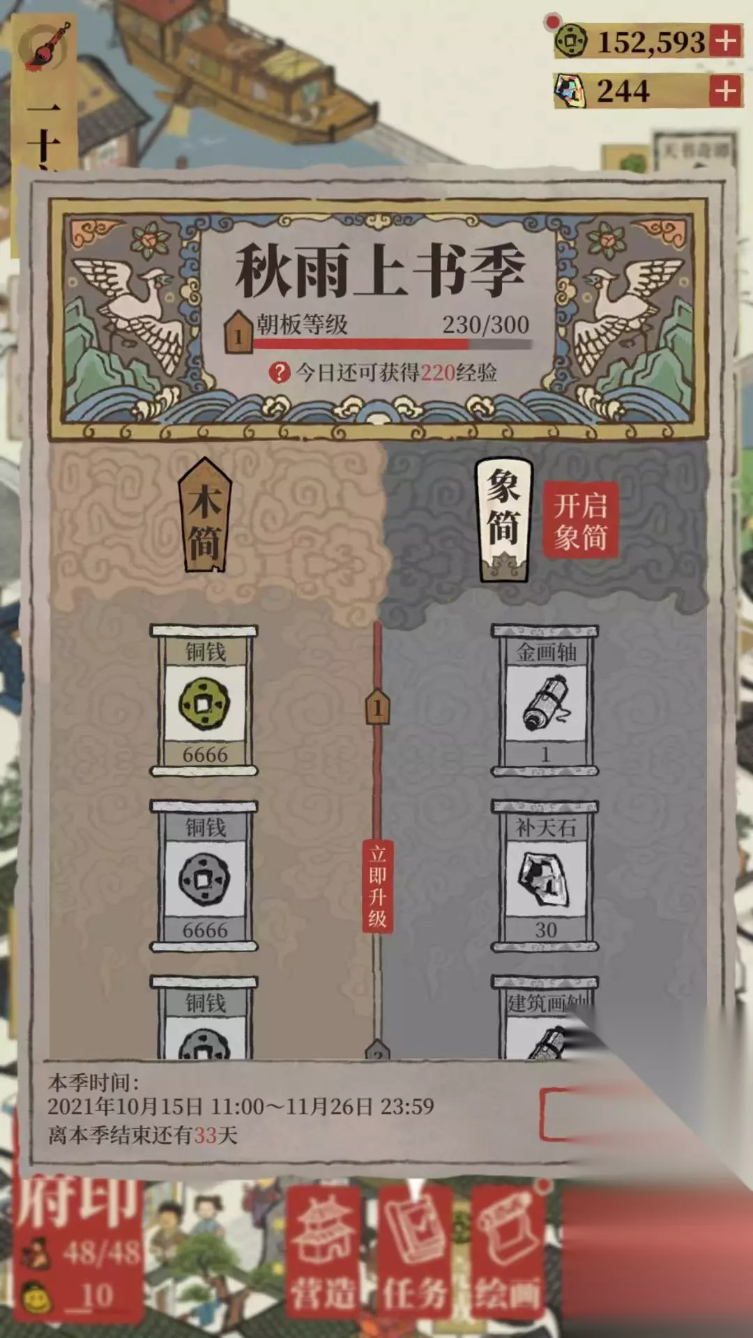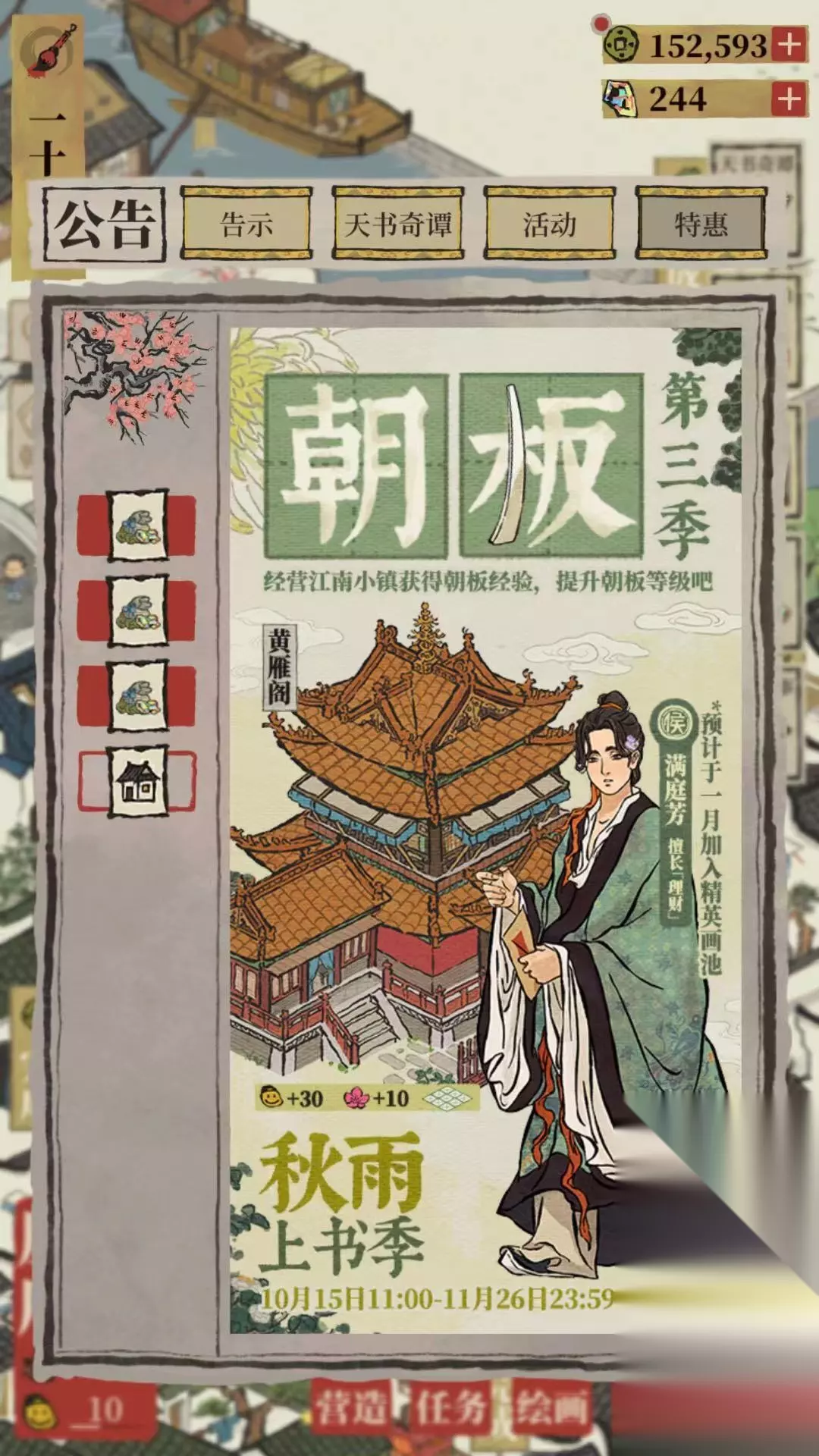 玩家进入游戏后,可以在主页面的公告中看到新活动第三季朝板,秋雨上书季,此活动通过经营江南小镇可以获得木简朝板经验,提升朝板等级,免费获得补天石,铜钱等奖励。还可以通过购买获得象简权益,通过朝板经验解锁专属奖励,全新侯级别居民【满庭芳】(预计将于1月加入经营花池),全新建筑【黄雁阁】。此活动从10月15日至11月26日。