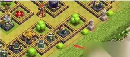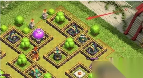 部落冲突14本三星最稳流派玩法如下: 1、先在右上角这里下一个天使、女皇,然后再上咏王。打掉这里的小炮后再上一个冰人可以用来抗伤,往前推。