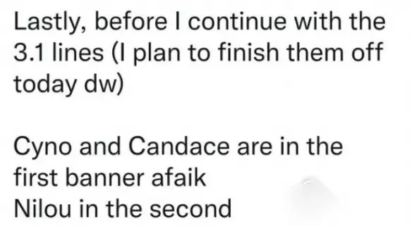 目前只有内鬼爆出的消息,具体如下,不排除最后更的可能。 第一期:赛诺,坎蒂丝 第二期:妮露 其实《原神》3.1版本角色池顺序介绍的这个解决方法还是非常简单的,相信大家自己研究也能够研究出来。如果你有其他更好的解决方案,不妨直接在评论区留言告诉小编,小编会快速进行更新的。 声明:233乐园登载此文出于传递信息之目的,不代表233乐园赞同其观点或证实其描述,若侵权请来信告知,我们将及时处理。