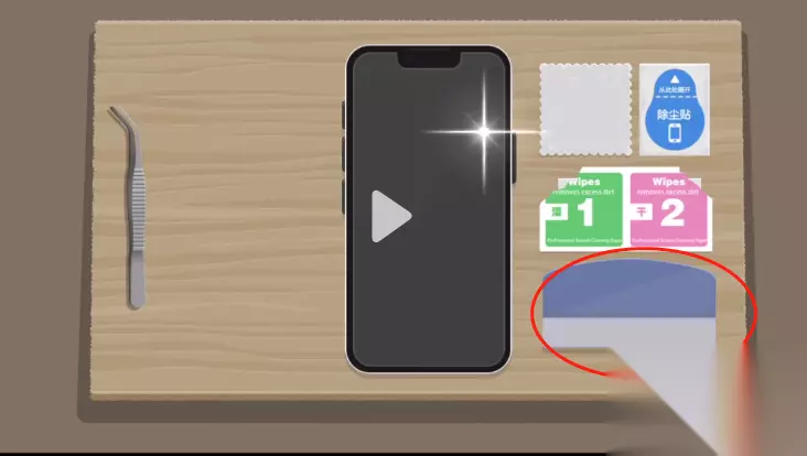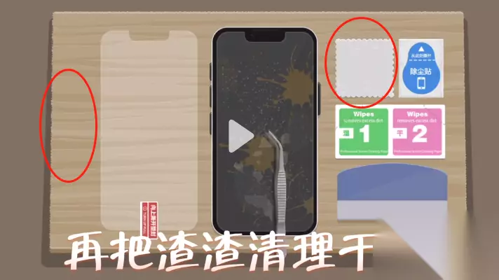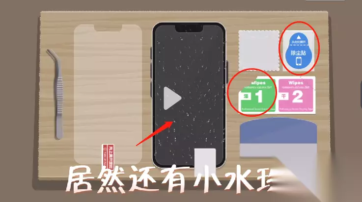 4、【湿纸巾】擦完后会留下【小水珠】,用【2号干纸巾】擦一擦就好了,最后贴上【新膜】用【塑料板】挂掉【气泡】就可以通关啦!