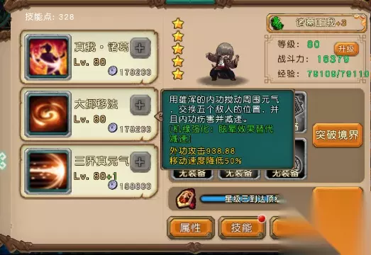 二技能大挪移法:用浑厚的内功搅动周围元气,交换五个敌人的位置,并且内功伤害并减速。(可直接将敌方后排输出换为到前排便于一举歼灭)