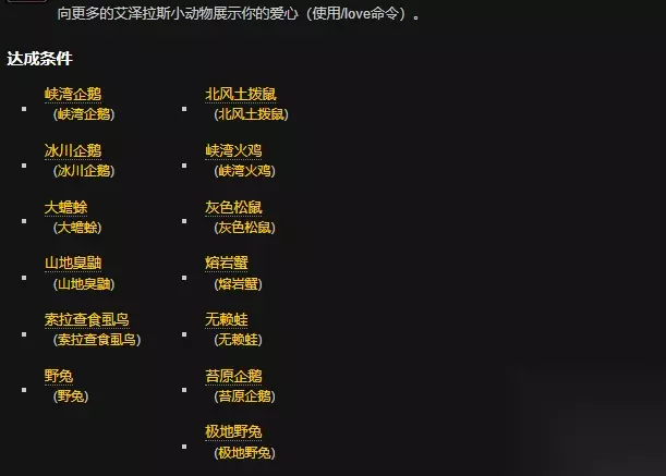 魔兽世界中有着许许多多的成就,今天给大家带来的是陪伴我成长的小松鼠们成就成就,相信很多小伙伴们不知道陪伴我成长的小松鼠们成就怎么完成,那么小编给大家带来具体完成方法。 陪伴我成长的小松鼠们成就攻略 这个成就需要向以下小动物施放/LOVE 示爱动作 •极地野兔•北风土拨鼠•峡湾企鹅 •峡湾火鸡•冰川企鹅•灰色松鼠 •大蟾蜍•熔岩蟹•山地臭鼬•无赖蛙 •索拉查食虱鸟•苔原企鹅•野兔 先告诉这些企鹅的位置 就是各个大陆的海边浮冰 TOC北面的海上浮冰有冰川企鹅 苔原做钓鱼日常断臂的地方有苔原企鹅 嚎风峡湾有很多东西 企鹅 在海边 火鸡在地图中央的一个丘陵上 多得很 附近有山地臭鼬 主要是 好多小动物看名字也能知道个大概位置 比如 索拉查食虱鸟 建议你一起做四个成就:我起爱的小松鼠们 伴我成长的小松鼠们 控制虫害 火鸡终结者 杀峡湾火鸡就可以完成 无赖蛙在嚎风峡湾LM港口营地 外面活动 网上给出的固定坐标只能表示收集坐标的人在那里看到了目标而不能说一定是那里 跑成就这种事别急 慢慢来 早晚能跑到8000的