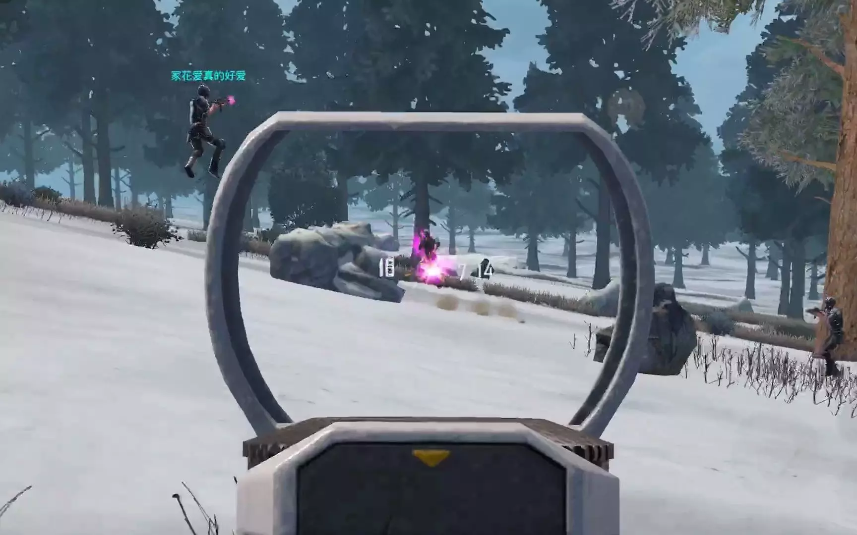 这是《王牌战争》怀旧模式的开荒游戏内容,展示了玩家在野外区域持枪战斗、拾取装备、换弹作战的开荒遭遇过程,呈现了该模式下的战斗玩法。