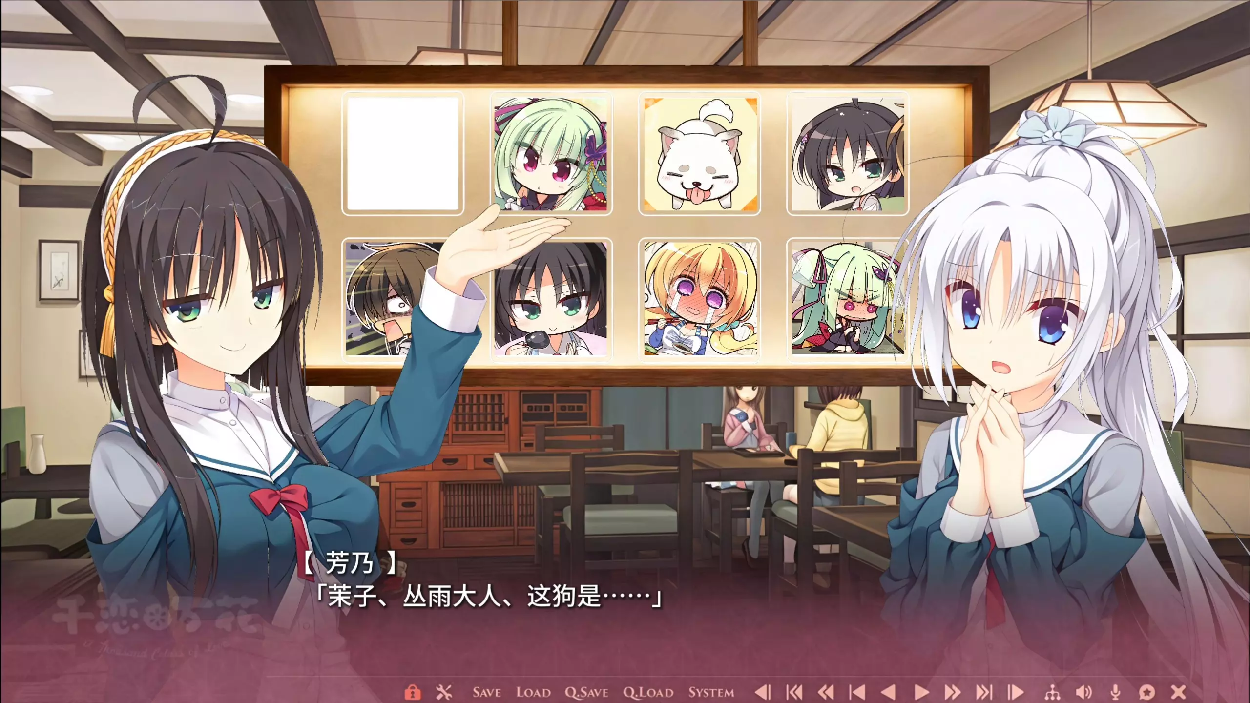 这是柚子社游戏《千恋*万花》的相关内容,展示了角色茉子以小狗形象出现的趣味互动情节,还有和将臣的相关对话,呈现出轻松搞笑的场景。