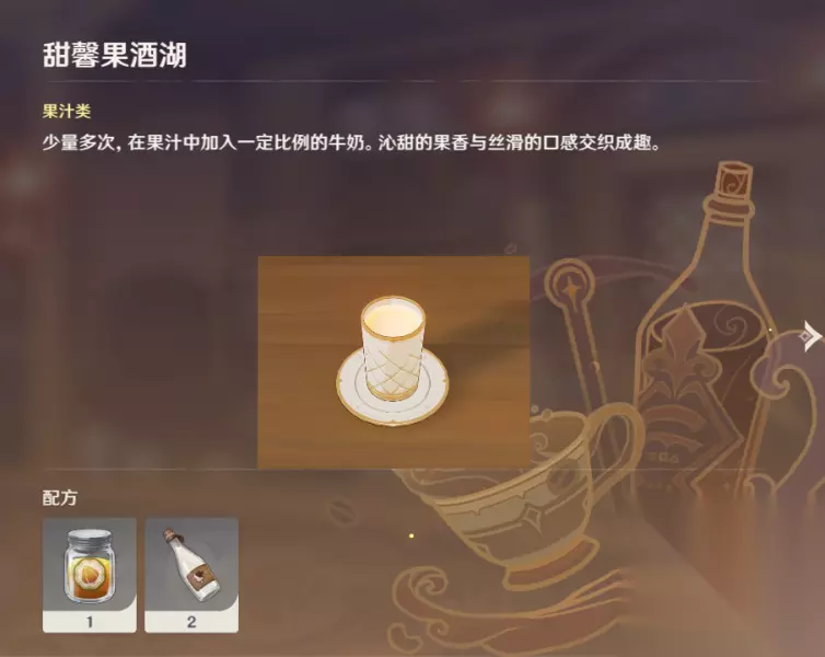 原神曲生酌微梦甜馨果酒湖怎么调 【甜馨果酒湖】 一份果汁 两份牛奶(少量多次,在果汁中加入-定比例的牛奶。沁甜的果香与丝滑的口感交织成趣。)