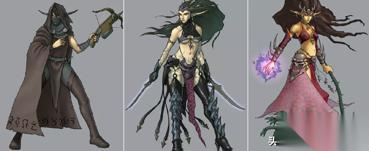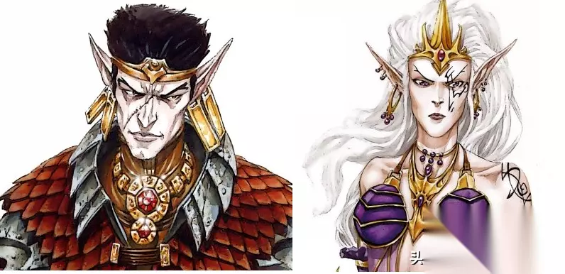 我们可以看到,卓尔精灵的皮肤是乌黑色的,发色一般为浅色,大多是白色或银色、淡黄色,眼睛的颜色通常是鲜艳的红色。而《英5》中黑暗精灵们的肤色则相对来说更加接近游戏中的人类,同样我们从两名英雄的原画上也可以看到,他们的眼睛颜色也基本和人类无异。