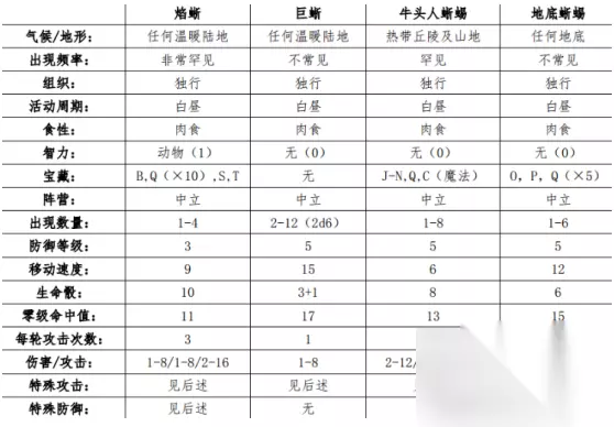 龙与地下城中对地底蜥蜴的描述是这样的:这种蜥蜴可以依靠其指尖有吸盘的四足在墙壁或天花板上奔行,它们可以用自己的大颚咬住受害者,造成双倍的伤害。且受害者会在随后的每一轮自动承受额外的伤害。任何人类或者体型更小的猎物若被它们的舌头卷住,就会被拽进蜥蜴嘴里,并在下一轮受到啮咬伤害——除非它通过了一个开门检定。更加详细一些的参数如下表所示,可以看得出来地底蜥蜴确实有比较优秀的机动性,无论是成为代步坐骑还是充当骑士的作战工具都说得过去。