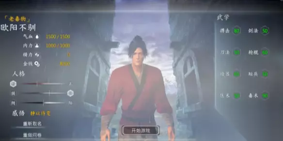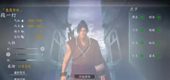 4、段一灯 【一灯大师】 唯一称号:慈悲为怀 所有武学威力上升40%,道德越高技能威力越强 自带称号:武林中人、富二代 武器:白虹剑、乌蚕丝手套 功法:凌尘剑谱、药石野集 感悟:以柔克刚 服装:噶玛寺僧袍