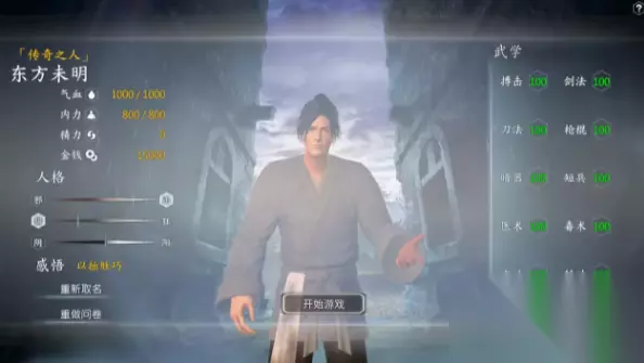 河洛群侠传一周目隐藏角色怎么选 选择答案: 1、东方未明:只要改名字为东方未明即可 2、洪乞儿:按顺序选择6、1、5、1、1 3、周逍遥:按顺序选择6、3、5、1、5 4、段一灯:按顺序选择6、5、4、1、2 5、欧阳不训:按顺序选择6、3、4、7、4 6、黄潮生:按顺序选择6、3、1、6、3 角色属性详解: 1、东方未明 全属性100,官方外挂 唯一称号:传奇之人 技能威力增加50%且有50%几率造成2次伤害、资质+10、体魄+10 自带称号:问卷自选 武器:猛虎护手 功法:大手印 感悟:问卷自选 服装:店小二服
