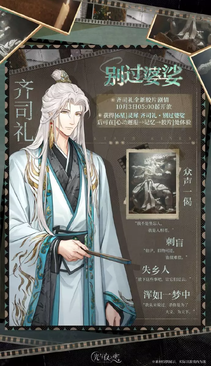 ※ 由于配音演员身体欠佳,部分语音无法按照原定计划完成收录,齐司礼・别过婆娑配套[胶片]剧情将暂时静音实装,后续完成补录后补充实装,敬请谅解。