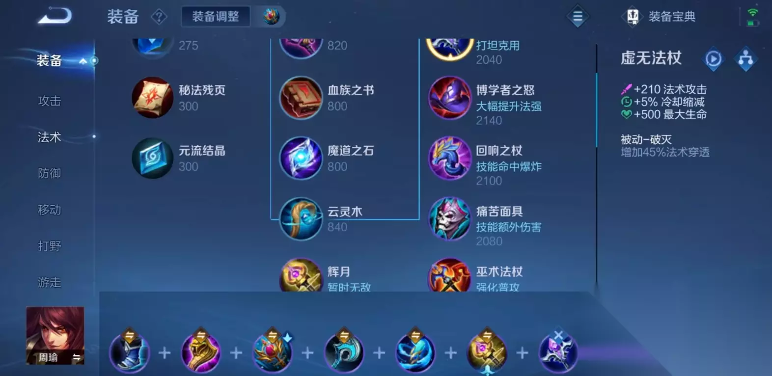 特别适合对面刺客多或者自己容易被切的情况,装备包括虚无法杖、抵抗之靴、噬神之书、不死鸟之眼、极寒风暴和痛苦面具,主打平衡输出和防御。虚无法杖增强法术穿透,对付高魔抗英雄很有效,抵抗之靴减少控制时间,让周瑜走位更灵活。不死鸟之眼提升回血效果,配合噬神之书,能让周瑜在火区里持续回血,极寒风暴提供冷却缩减和物理防御,在团战里能多扛几下伤害。