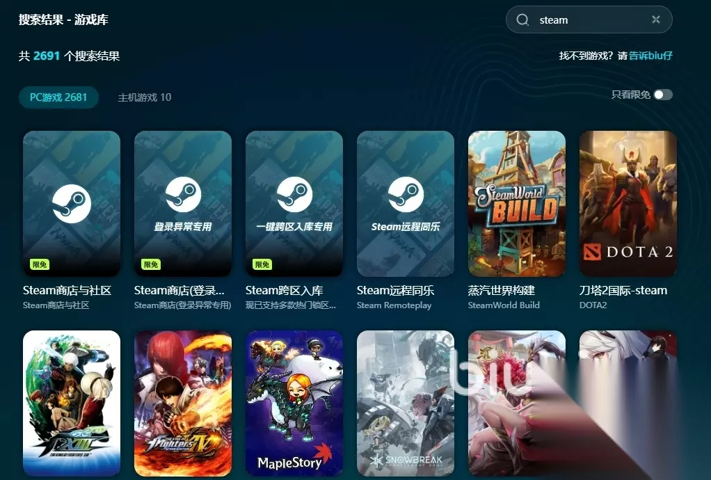 此外平台内游戏也非常的多,国内外上架的不少都有,而且各个渠道服在这里都可以进行登录,此外游戏商店也可以在这里加速,比如switch或者steam,大家下游戏的时候还能加速下载,这样想玩新游戏的话速度就会快很多。