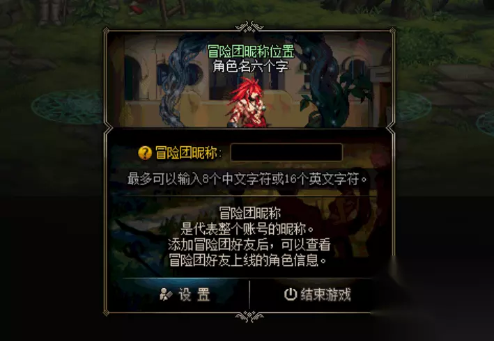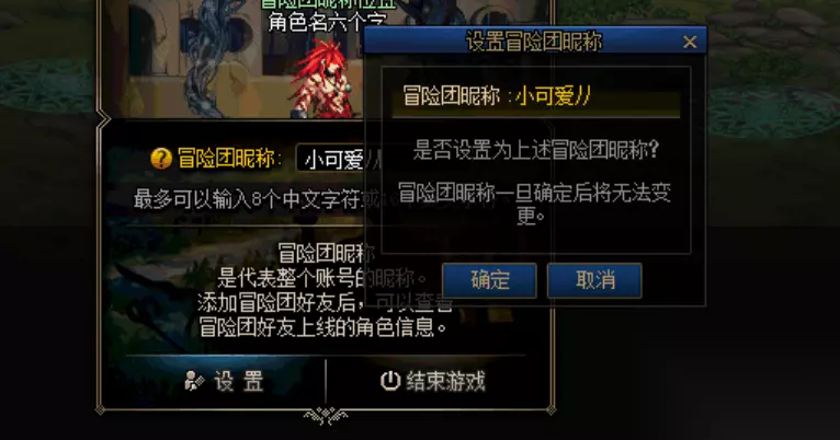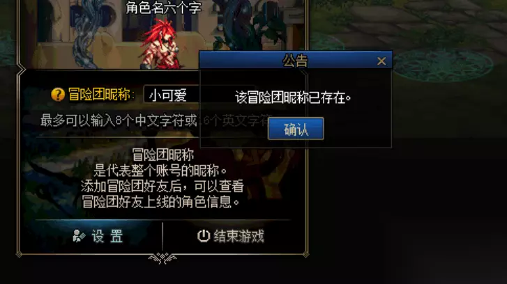 二、输入了我们想好的名称之后点击设置按钮来查看这个冒险团是否已经存在了,如果已经存在了的话我们是无法使用这个名称的,因为每个人的名称都是第一无二的。